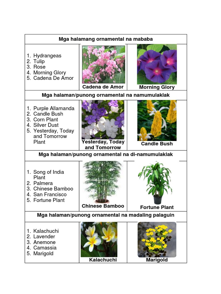 Ang mga halamang ornamental ay may ibat ibang katangian ito ay ang mga halamanpunong ornamental na may mataas at may mababa may namumulaklak at di-namumulaklak may madaling palaguin at may mahirap palaguin may nabubuhay sa lupa at may nabubuhay sa tubig. Jul 18 2019 HALAMANG ORNAMENTAL Heto ang mga halimbawa ng mga halamang ornamental sa Pilipinas na maari mong bilhin at ilagay sa iyong bahay. Halamang ornamental na di madaling palaguin Halamang ornamental na di madaling palaguin.