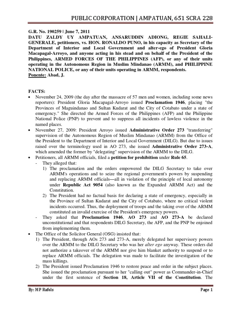 Then President Gloria Macapagal-Arroyo issued Proclamation 19461 placing the Provinces of Maguindanao and Sultan Kudarat. June 7 2011 DATU ZALDY UY AMPATUAN ANSARUDDIN ADIONG REGIE SAHALIGENERALE petitioners vs. Full Case - Constitutional Law 1.