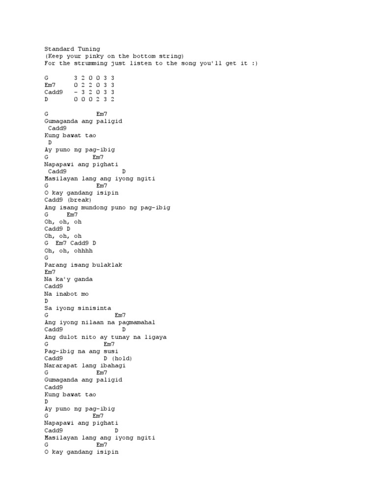 Verse I G Cadd9 Parang isang bulaklak na kay ganda Em D Na. Ito ay puno ng pag-ibig puno ng pagsusunod sa Kalooban ng Dakilang Ama. Kung bawat tao ay puno ng pag-ibig G Cadd9 Napapawi ang pighati Em D Cadd9 Masilayan lang ang iyong ngiti Em D Cadd9 O kay gandang isipin Cadd9 And isang mundong puno ng pag-ibig Interlude G Oh oh ohhh.